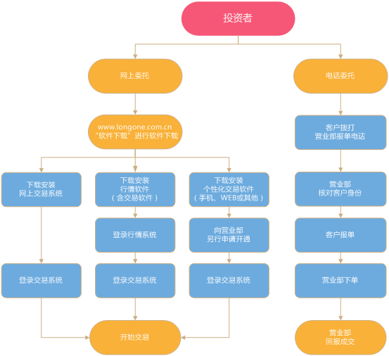 投資者完成期貨賬戶的開戶并成功入金后,可按照以下流程進(jìn)行期貨交易,公司提供網(wǎng)上委托、電話委托等多種委托方式。