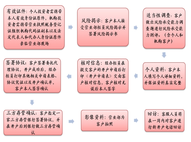 c、工作人員根據(jù)投資者申請和相關(guān)業(yè)務(wù)規(guī)定開立資金賬戶和三方存管賬戶,并告知后繼業(yè)務(wù)的辦理事宜;
